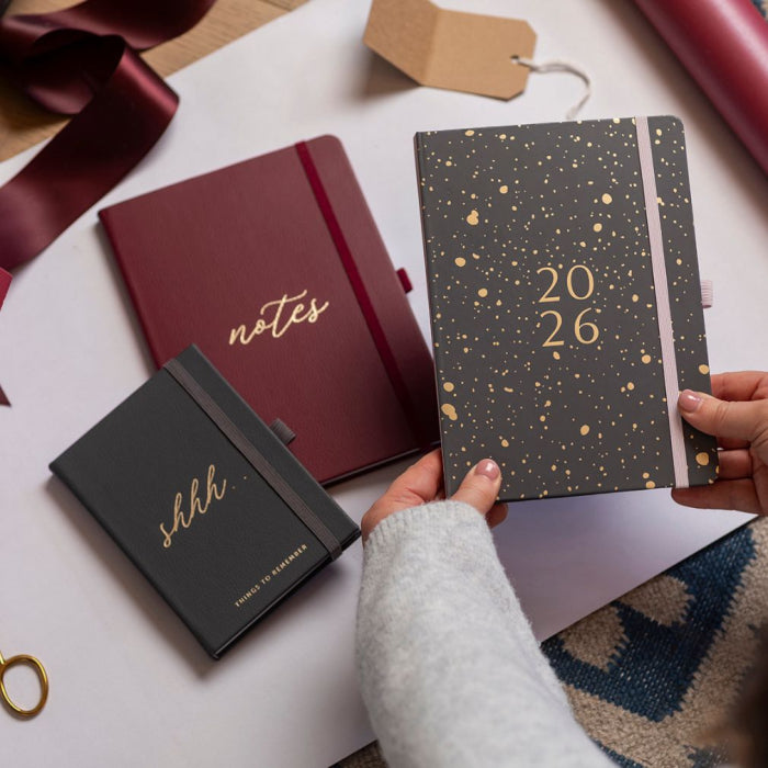 - FAMILY DIARY 2026 - Make 2026 your year to be beautifully organised with the Family Diary from Busy B, featuring a beautiful charcoal & gold foil cover, elastic closure band, pen loop (pen not included) and ribbon page marker. Runs January to December 2026.