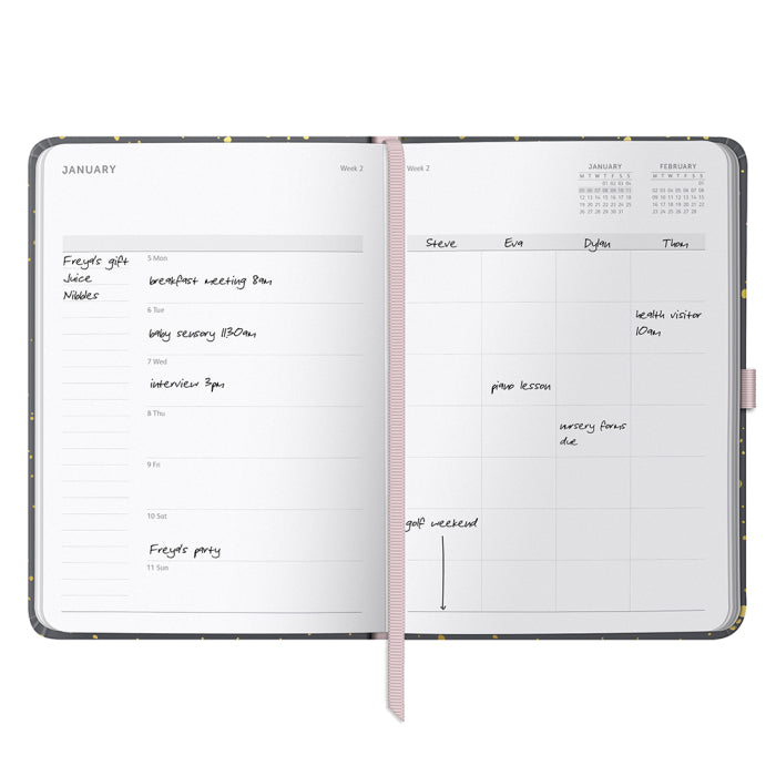 - WEEK TO VIEW FOR FIVE - Week to a view, with space for your week and up to four others. Plan ahead quickly with the mini calendars on each page.