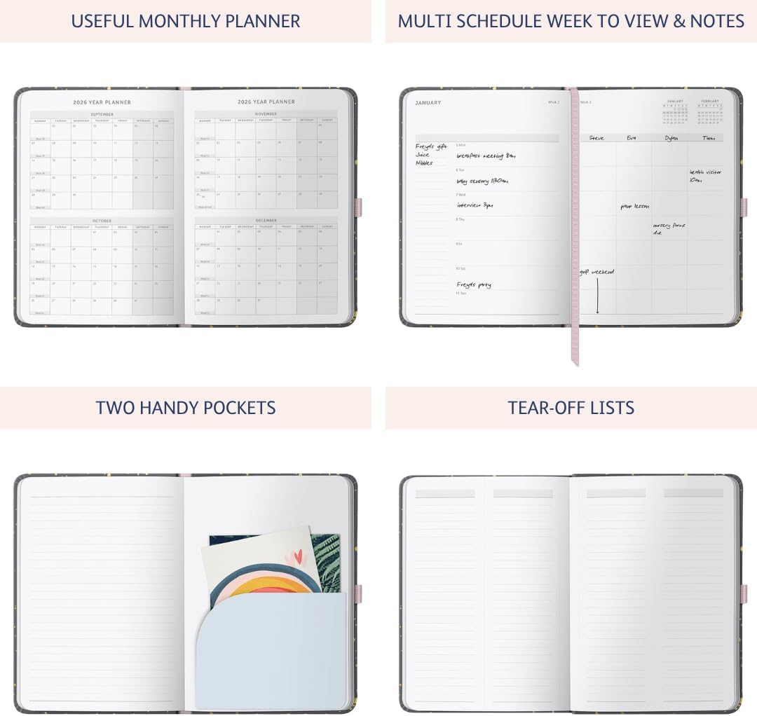 - VARIED LAYOUT - With space for up to five schedules, this diary is ideal for busy families. Two handy pockets store important documents, making it a central hub for household organisation.